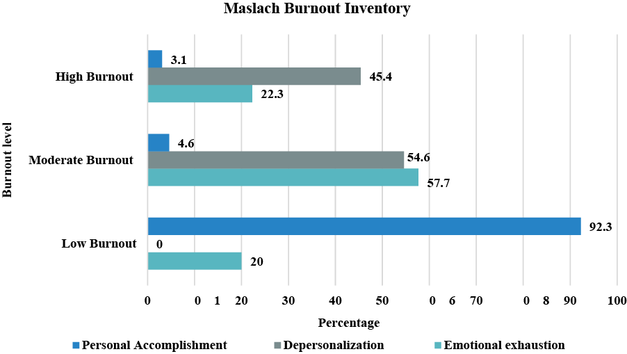 The following figure presents the levels of burnout experienced by nursing staff for each of the MBI test areas. In the context of the "Emotional Exhaustion" area, 22.3% of the nursing staff exhibited high levels of burnout, while 57.7% demonstrated moderate symptoms. Notably, only 20% of the participants exhibited low levels of burnout. In the case of the “Depersonalisation” area, 45.4% of cases resulted in high levels of burnout, while 54.6% resulted in moderate levels. There were no cases of low burnout. With regard to the “Personal Accomplishment” area, 3.1% of subjects have been identified as experiencing high levels of burnout, 4.6% are exhibiting moderate symptoms, and 92.3% demonstrate low levels of burnout (Fig.).