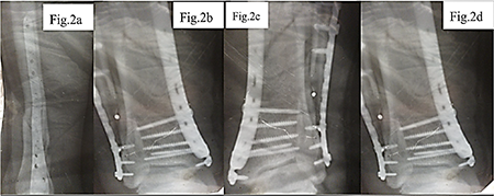a – Anteroposterior view of the tibia following osteosynthesis with two metal plates; b – Lateral projection showing fixation with 16 screws securing the plates.; c – Follow-up lateral X-ray demonstrating correct positioning of implants; d – Control X-ray confirming stability of the osteosynthesis construct