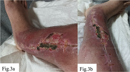 a – Elongated postoperative wound on the medial surface of the lower leg. The wound shows moderately hyperemic margins, swelling of surrounding tissues, and a centrally located dark greenish eschar with areas of maceration and superficial necrosis, indicating signs of impaired healing and local inflammation.; b – Same wound from a different angle. A linear wound with eschar formation is observed, along with partial marginal epithelialization, persistent hyperemia, residual edema, and signs of delayed healing at the site of previous surgical intervention