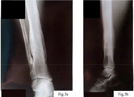 Control radiography (Fig. 5 a, b) demonstrated complete consolidation of the fractures and formation of hypercallus as a marker of restored osteoblastic activity. This confirmed the reversibility of metal-induced immune osteopathy and the importance of correcting immune, vascular, and neurogenic disorders together with ensuring mechanical stability.