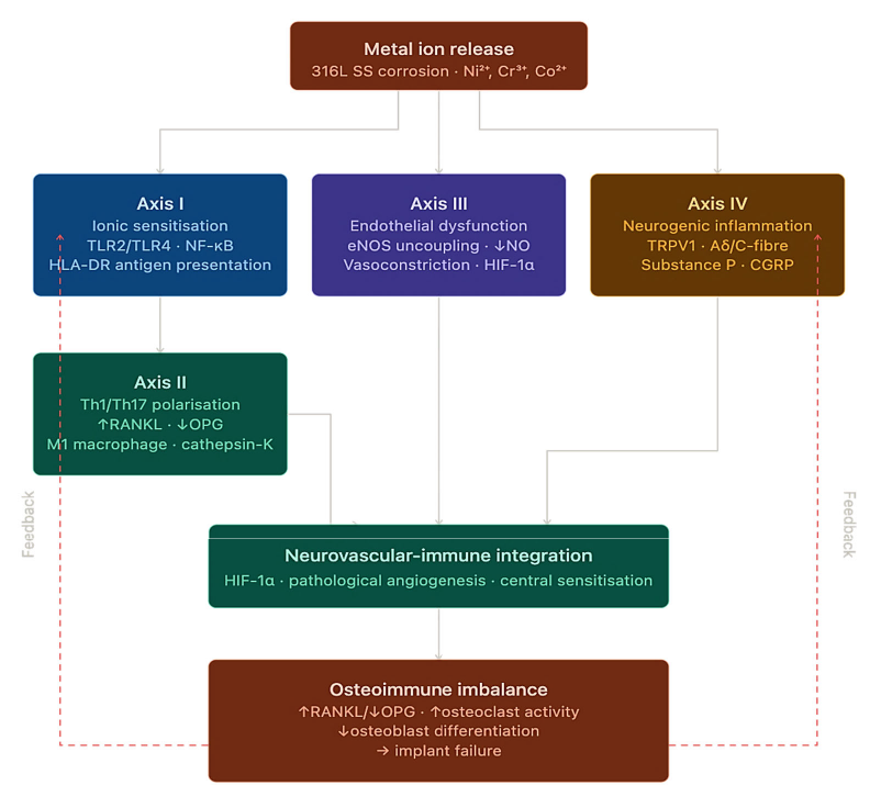 Molecular-neurovascular syndrome of osteoimplant hypersensitivity. Based on the analyzed clinical case, we propose a new integrative pathophysiological process that combines ion-mediated, immune, endothelial, and neurogenic responses into a unified system of local microcirculatory homeostasis disturbances in bone tissue (Fig. 6). In contradistinction to earlier conceptual frameworks – most notably those advanced by Hallab and Jacobs (2009) [34] and Samelko et al. (2016) [35] which delineated discrete, largely non-overlapping facets of metal ion-induced peri-implant inflammation – the concept of the Molecular-Neurovascular Osteoimplant Hypersensitivity (MNOH) syndrome proposed herein integrates the ionic, immunological, endothelial, and neurogenic components into a single self-amplifying pathological circuit. Each of the four axes described below is corroborated, in the present clinical observation, by corresponding laboratory or instrumental data, thereby lending empirical weight to what would otherwise remain a purely theoretical construct.